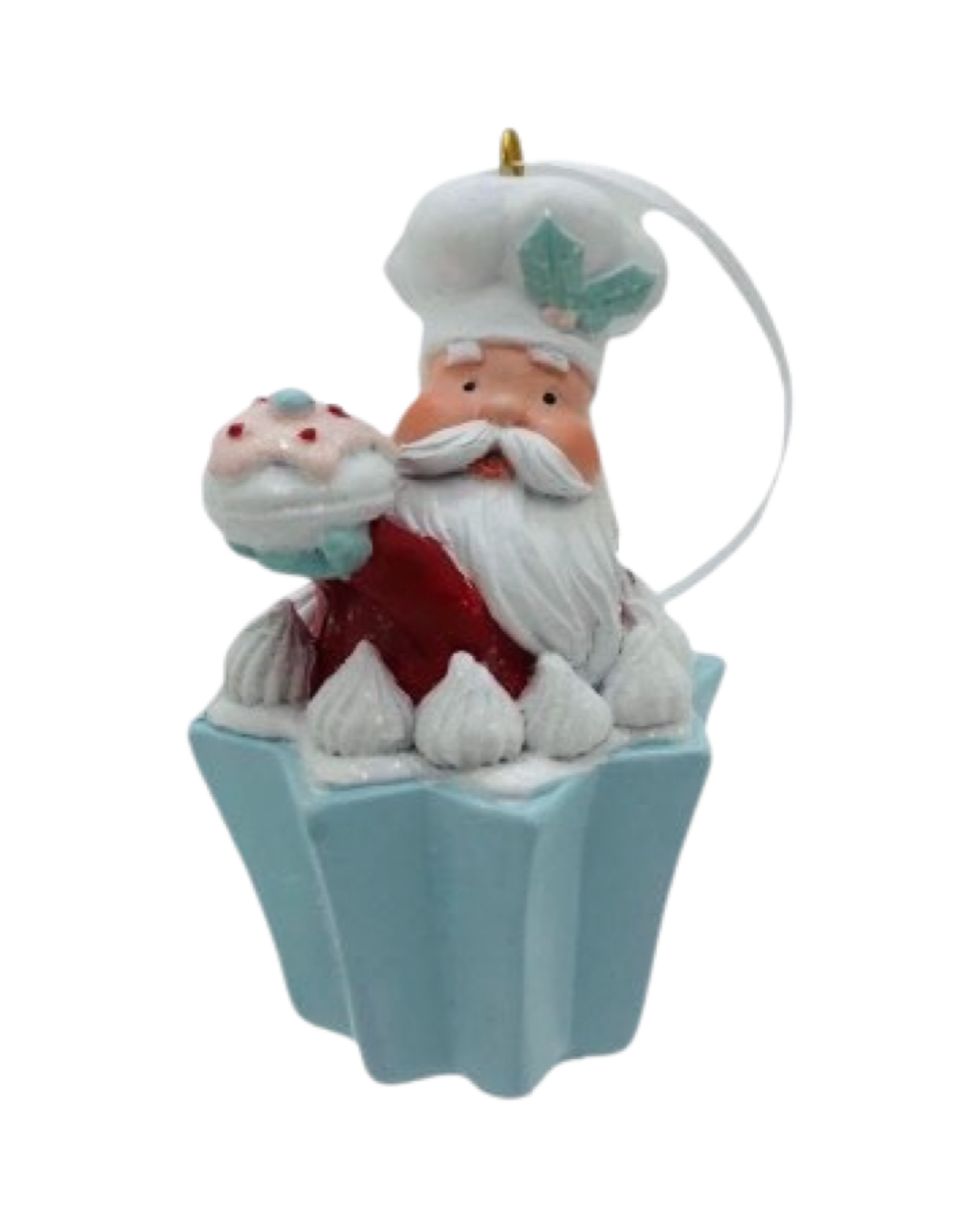This SANTA CUPCAKE is crafted from polyresin and measures 11cm in height. Its intricate detailing and captivating design makes it perfect to add a festive touch to any room or table setting.